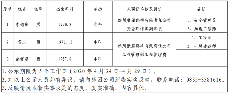 根據(jù)雅安市交通建設(shè)(集團(tuán))有限責(zé)任公司招聘公告,經(jīng)公開報(bào)名、資格初審、筆試、面試、體檢考察等環(huán)節(jié),現(xiàn)將以下3名擬聘用人員予以公示: