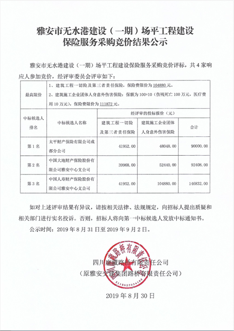 雅安市無水港建設(shè)(一期)場平工程建設(shè)保險服務(wù)采購競價結(jié)果公示