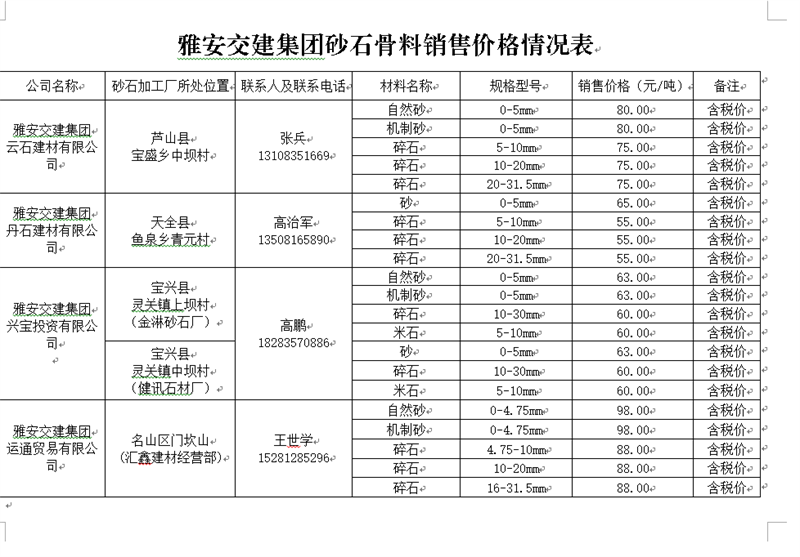 一、云石建材有限公司。云石公司是蘆山縣人民政府指定蘆山縣投資經(jīng)營管理有限責任公司與雅安市交通建設(集團)有限責任公司共同組建的合資公司。公司在蘆山縣寶盛鄉(xiāng)中壩村建立砂石生產(chǎn)線,年產(chǎn)各類砂石骨料約50萬噸,生產(chǎn)廠區(qū)距雨城區(qū)中心城區(qū)約60公里。