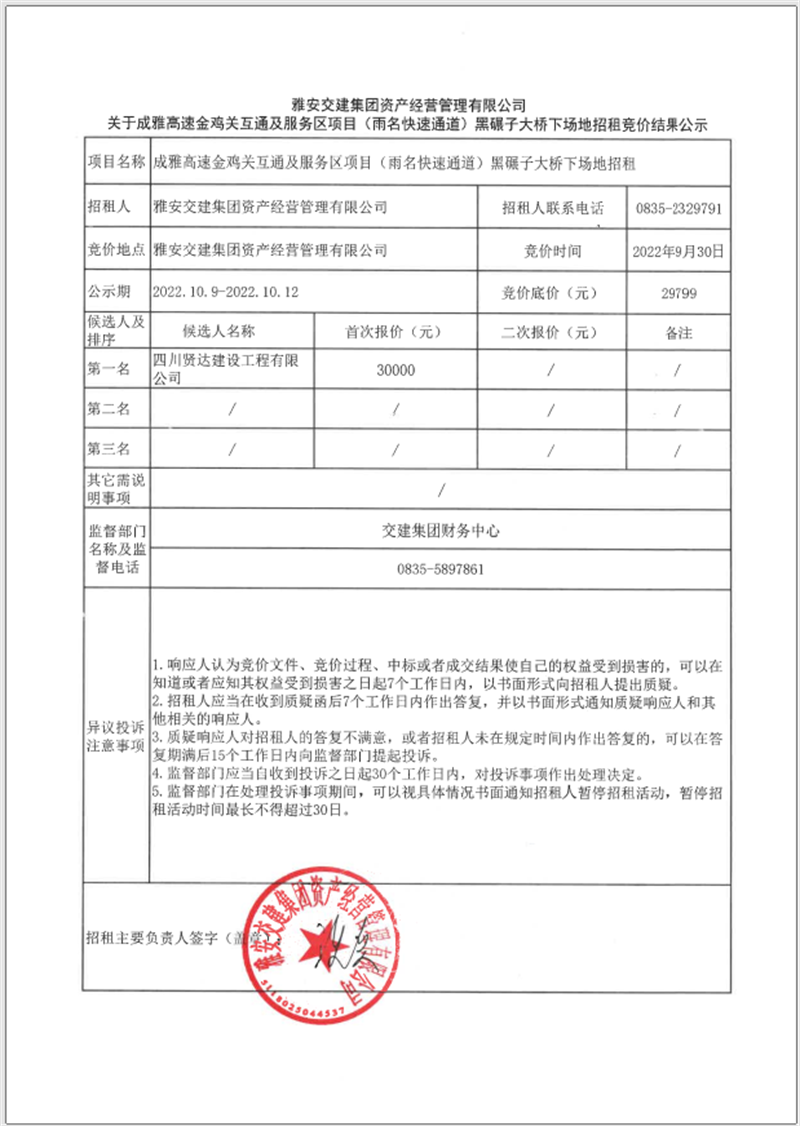 關(guān)于成雅高速金雞關(guān)互通及服務區(qū)項目(雨名快速通道)黑碾子大橋下場地招租競價結(jié)果公示
