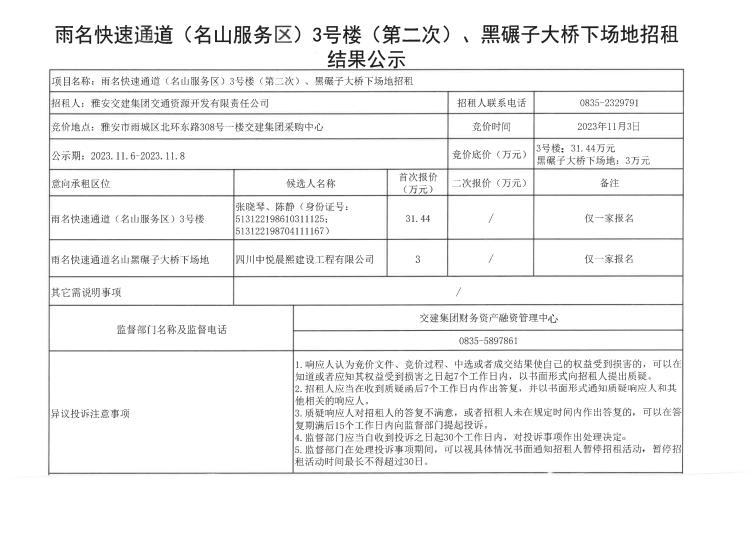 雅安交建集團(tuán)交通資源開發(fā)有限責(zé)任公司雨名快速通道(名山服務(wù)區(qū))3號(hào)樓(第二次)黑碾子大橋下場(chǎng)地招租結(jié)果公示