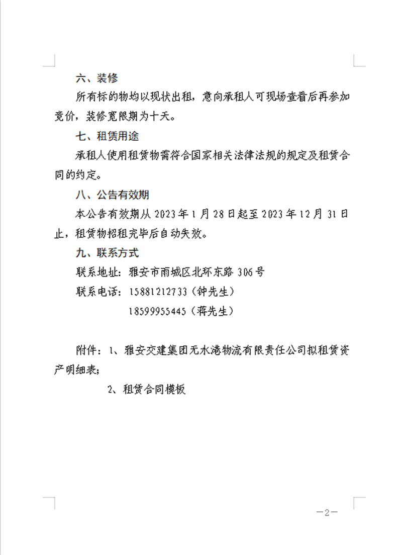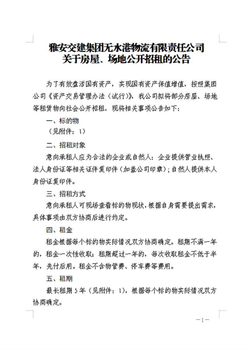 雅安交建集團無水港物流有限責(zé)任公司關(guān)于房屋、場地公開招租的公告