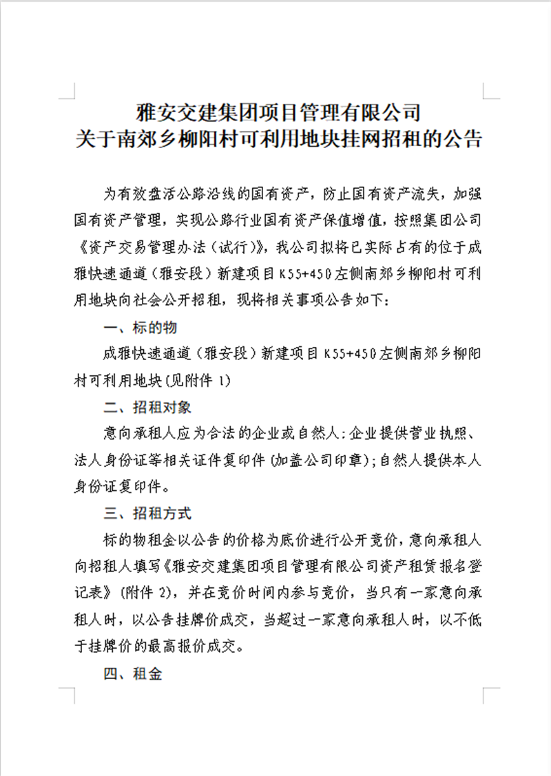 雅安交建集團(tuán)項(xiàng)目管理有限公司 關(guān)于南郊鄉(xiāng)柳陽村可利用地塊公開招租的公告資料