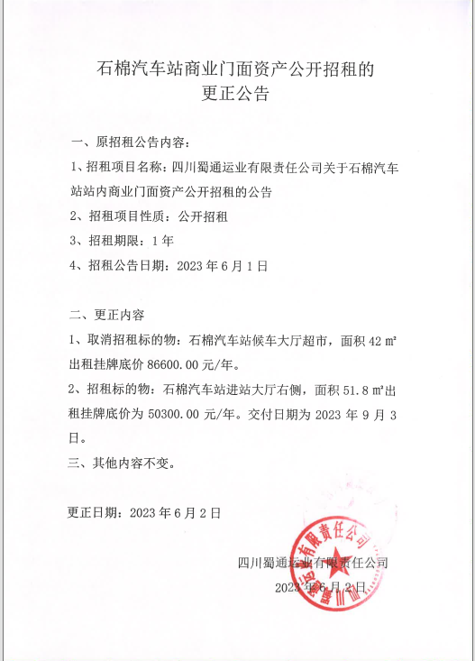蜀通公司石棉汽車站商業(yè)門面資產(chǎn)公開(kāi)招租的更正公告