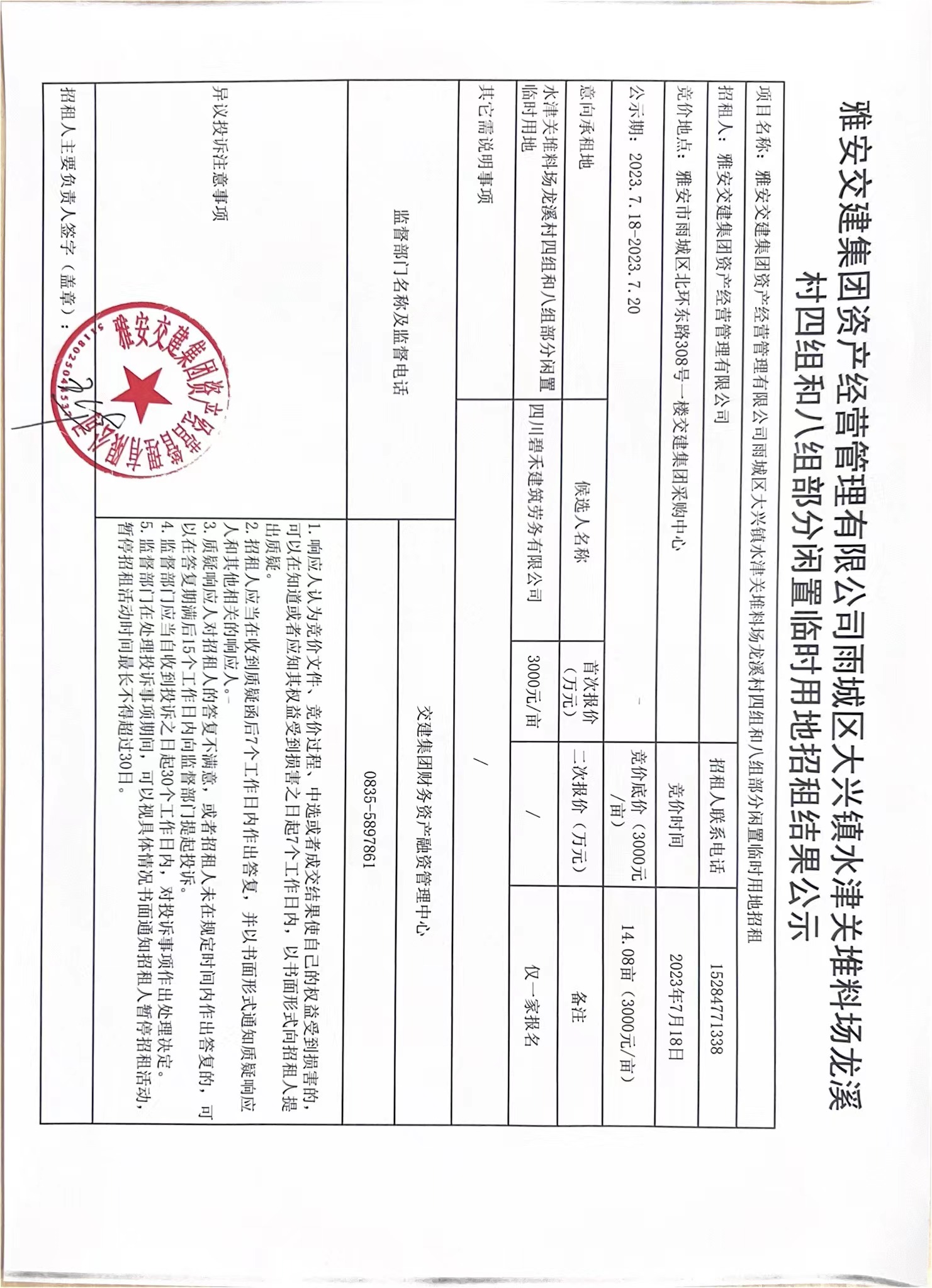 雅安交建集團資產(chǎn)經(jīng)營管理有限公司雨城區(qū)大興鎮(zhèn)水津關(guān)堆料場龍溪村四組和八組部分閑置臨時用地招租結(jié)果的公示