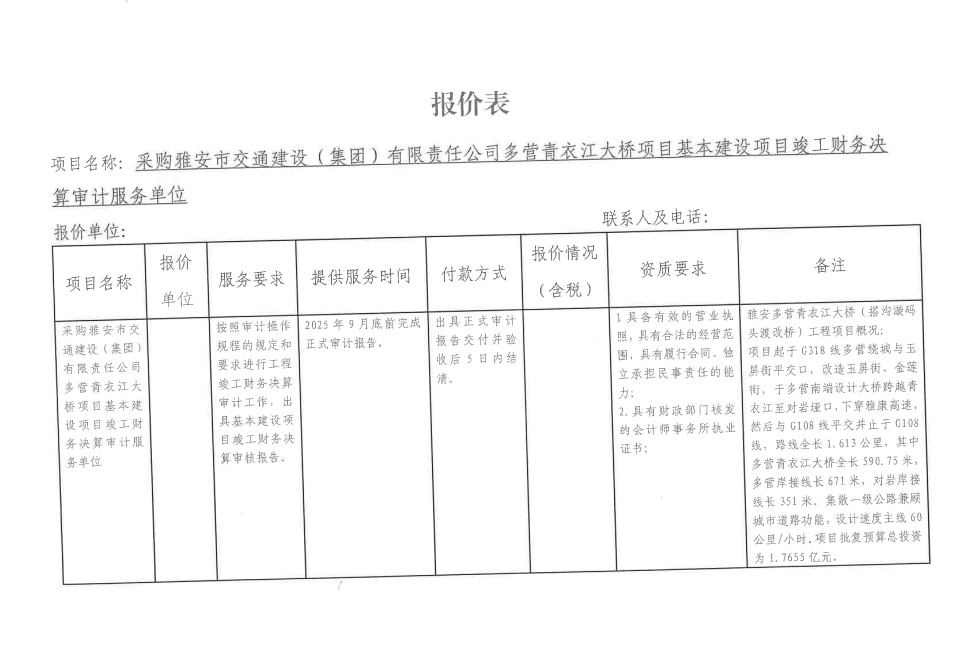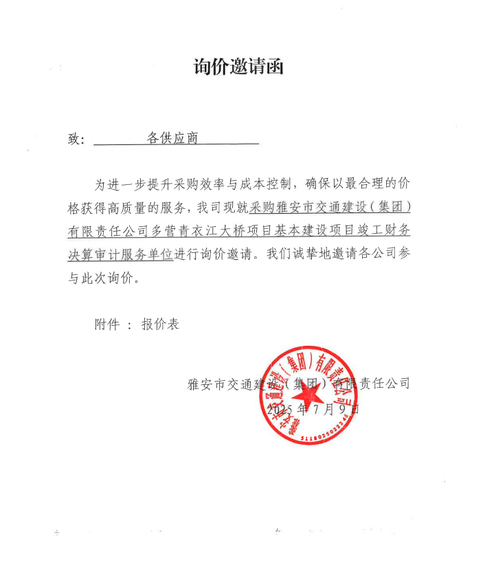 詢(xún)價(jià)邀請(qǐng)函——采購(gòu)雅安市交通建設(shè)(集團(tuán))有限責(zé)任公司多營(yíng)青衣江大橋項(xiàng)目基本建設(shè)項(xiàng)目竣工財(cái)務(wù)決算審計(jì)服務(wù)單位