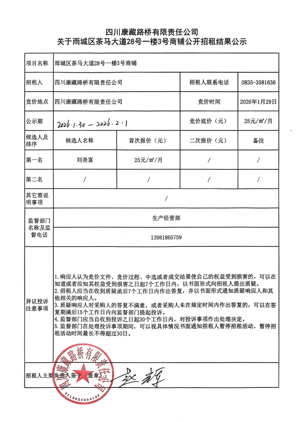 四川康藏路橋有限責(zé)任公司關(guān)于雨城區(qū)茶馬大道28號一樓3號商鋪公開招租結(jié)果公示