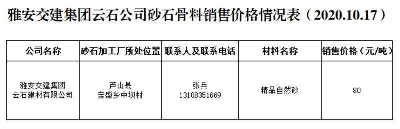 雅安交建集團(tuán)云石公司砂石骨料銷售價(jià)格情況表(2020.10.17)