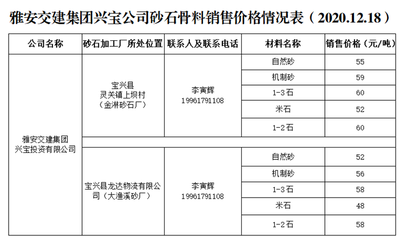 雅安交建集團興寶公司砂石骨料銷售價格情況表(2020.12.18)