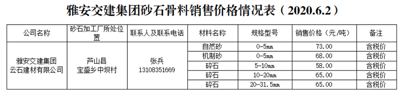 云石建材有限公司。云石公司是蘆山縣人民政府指定蘆山縣投資經(jīng)營(yíng)管理有限責(zé)任公司與雅安市交通建設(shè)(集團(tuán))有限責(zé)任公司共同組建的合資公司。公司在蘆山縣寶盛鄉(xiāng)中壩村建立砂石生產(chǎn)線,年產(chǎn)各類砂石骨料約50萬(wàn)噸,生產(chǎn)廠區(qū)距雨城區(qū)中心城區(qū)約60公里。