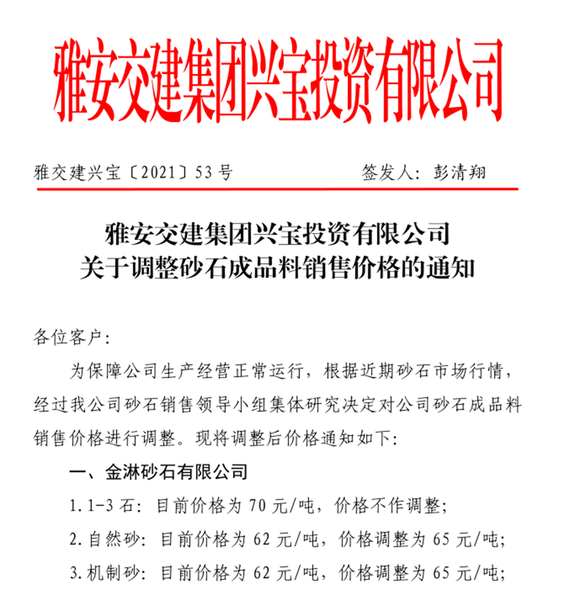 雅安交建集團(tuán)興寶公司砂石骨料銷售價(jià)格情況表(2021.8.12)