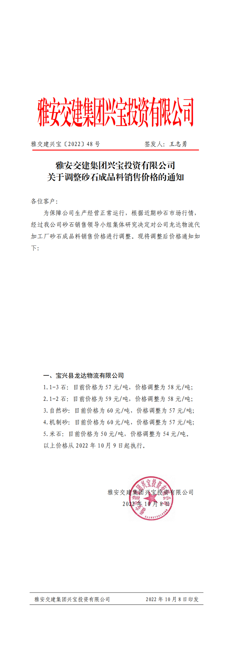 雅交建興寶〔2022〕48號 關(guān)于調(diào)整砂石成品料銷售價格的通知10.8