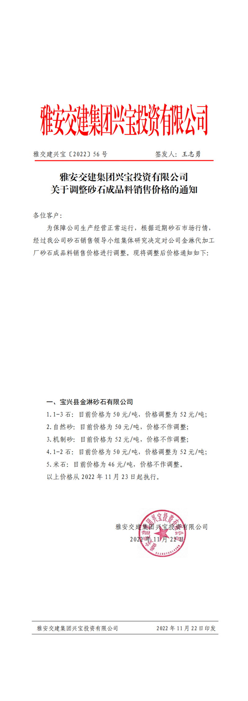 ÑŽ»½¨ÅdŒš¡²2022¡³56Ì–(h¨¤o) êP(gu¨¡n)ÓÚÕ{(di¨¤o)Õûɰʯ³ÉÆ·ÁÏäNÊÛƒr(ji¨¤)¸ñµÄ֪ͨ-11.22