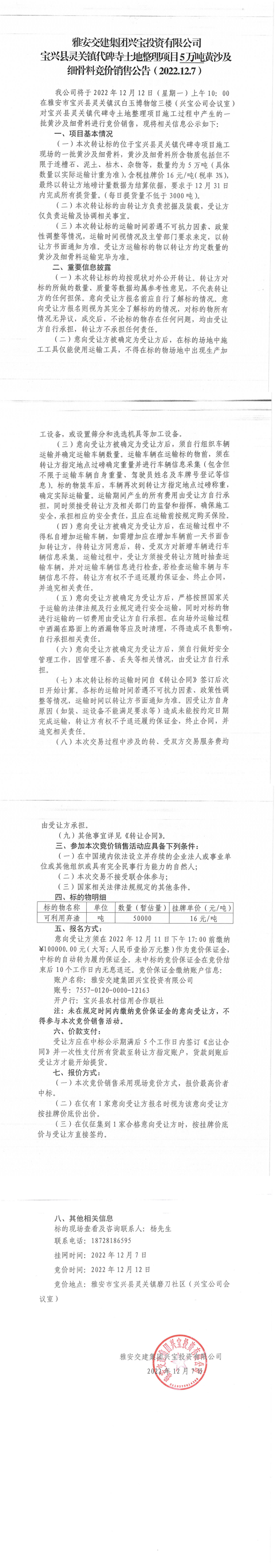 雅安交建集團(tuán)興寶投資有限公司寶興縣靈關(guān)鎮(zhèn)代碑寺土地整理項(xiàng)目5萬噸黃沙及細(xì)骨料競價銷售成交公告(2022-12-12)