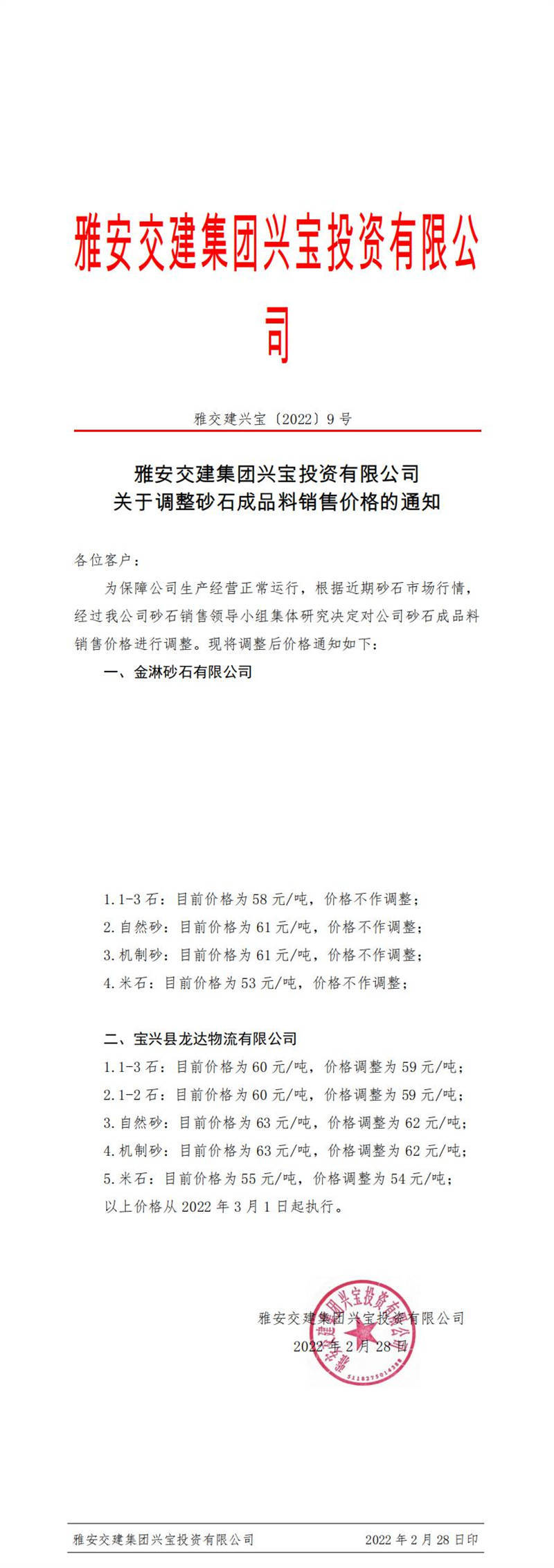 雅安交建集團興寶投資有限公司 關(guān)于調(diào)整砂石成品料銷售價格的通知(2022-2-23)