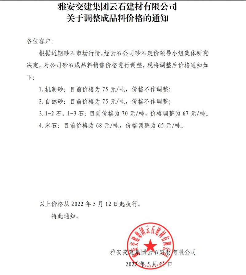 雅安交建云石建材有限公司調價通知-2022-5-12