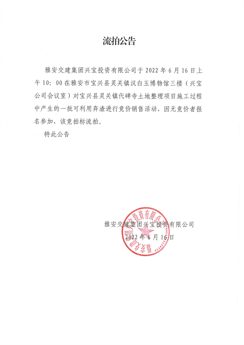 雅安交建集團(tuán)興寶投資有限公司寶興縣靈關(guān)鎮(zhèn)代碑寺土地整理項(xiàng)目-批可利用 棄渣第二次競(jìng)價(jià)銷(xiāo)售公告( 2022.6.16 )