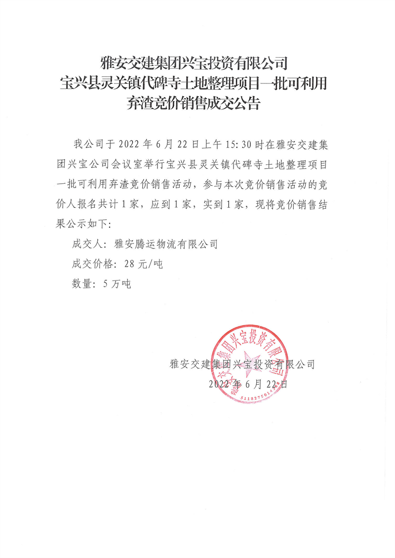 雅安交建集團(tuán)興寶投資有限公司 關(guān)于調(diào)整砂石成品料銷售價格的通知(2022-6-22)