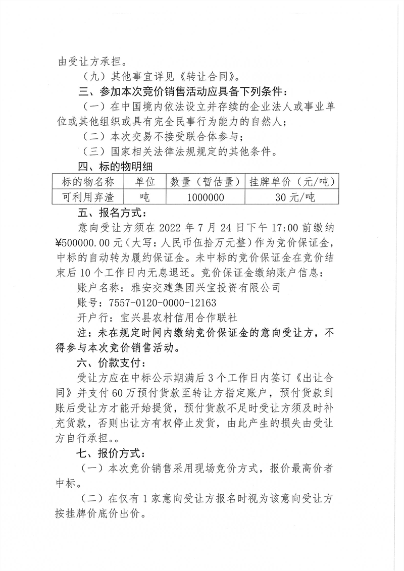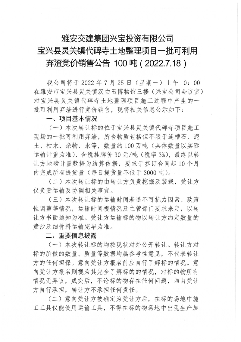 興寶公司寶興縣靈關(guān)鎮(zhèn)代碑寺土地整理項(xiàng)目10萬噸可利用棄渣競價銷售掛網(wǎng)公告掛網(wǎng)公告7.22(5萬噸)