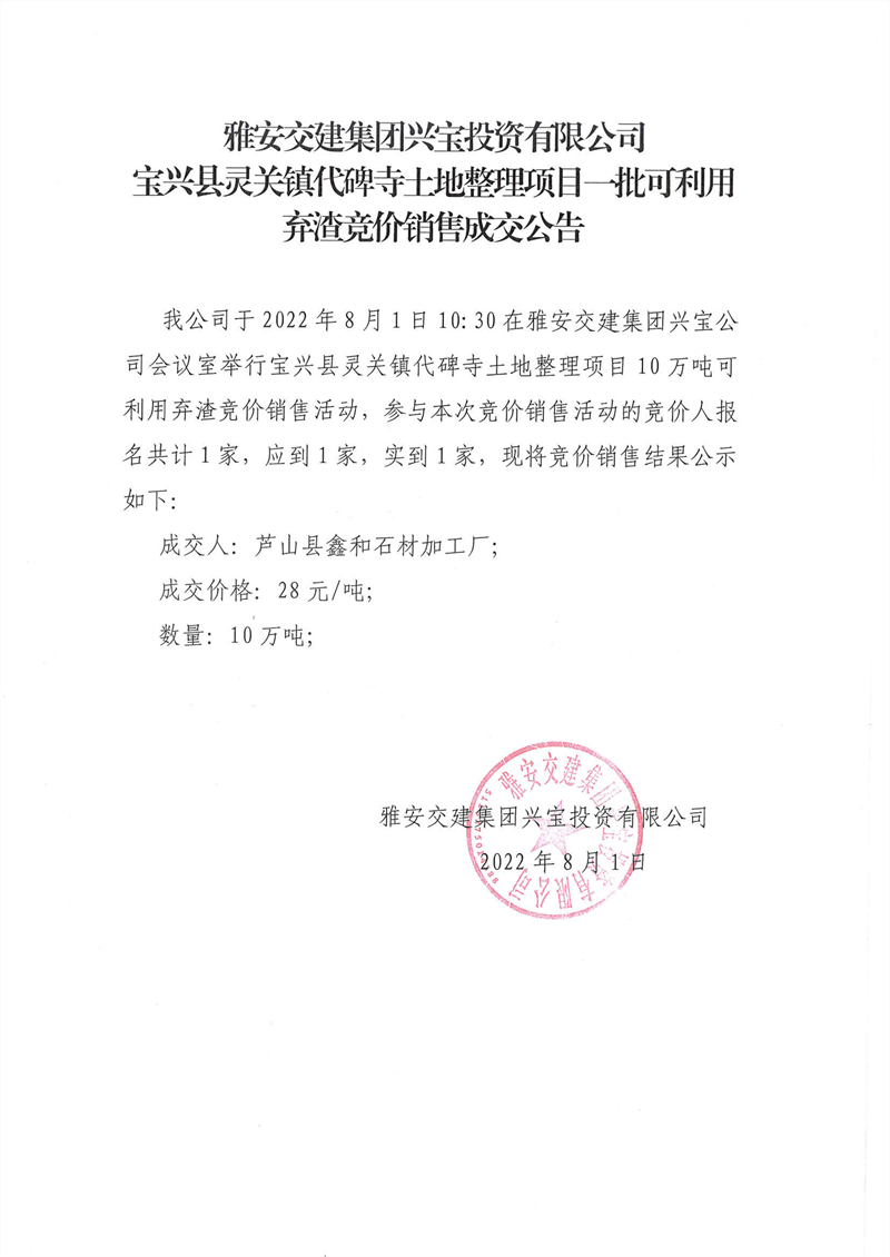 雅安交建集團(tuán)興寶投資有限公司靈關(guān)鎮(zhèn)代碑寺土地整理項目10萬噸可利用棄渣競價銷售成交公告(2022.8.1)