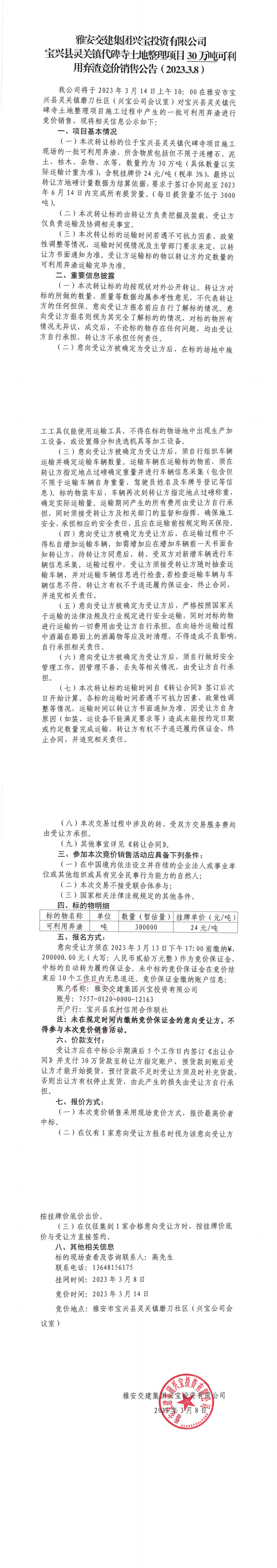 雅安交建集團(tuán)興寶投資有限公司靈關(guān)鎮(zhèn)代碑寺土地整理項(xiàng)目30萬(wàn)噸可利用棄渣競(jìng)價(jià)銷售公告(2023.3.8)