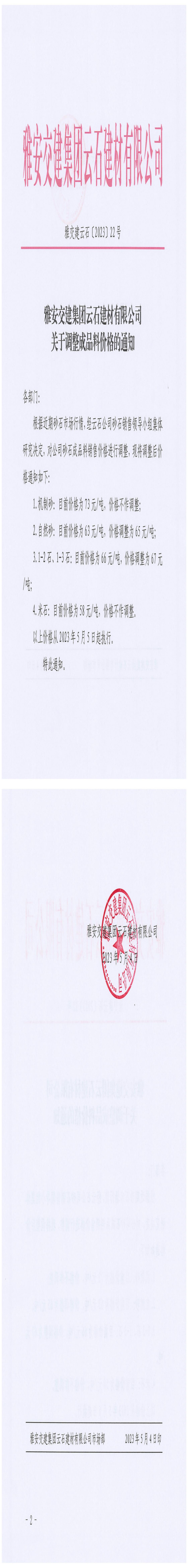 雅交建云石建材有限公司調(diào)價(jià)通知(2023-5-4)