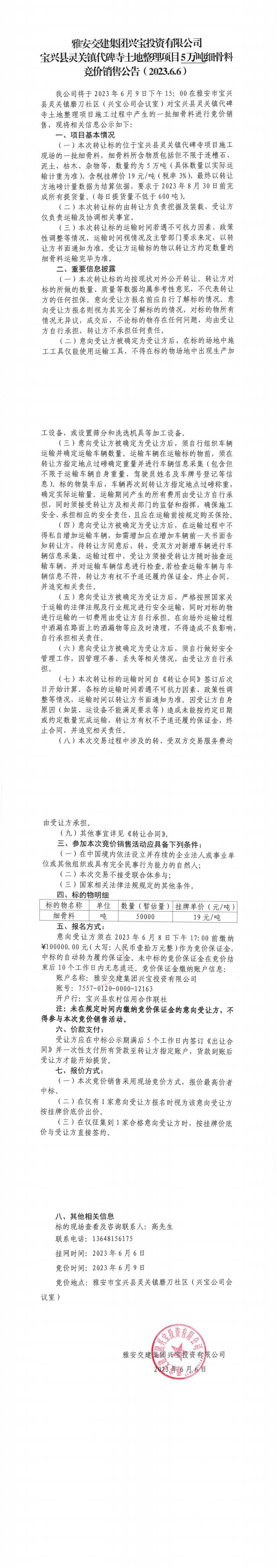 雅安交建集團興寶投資有限公司寶興縣靈關鎮(zhèn)代碑寺土地整理項目5萬噸細骨料競價銷售公告(2023.6.6)