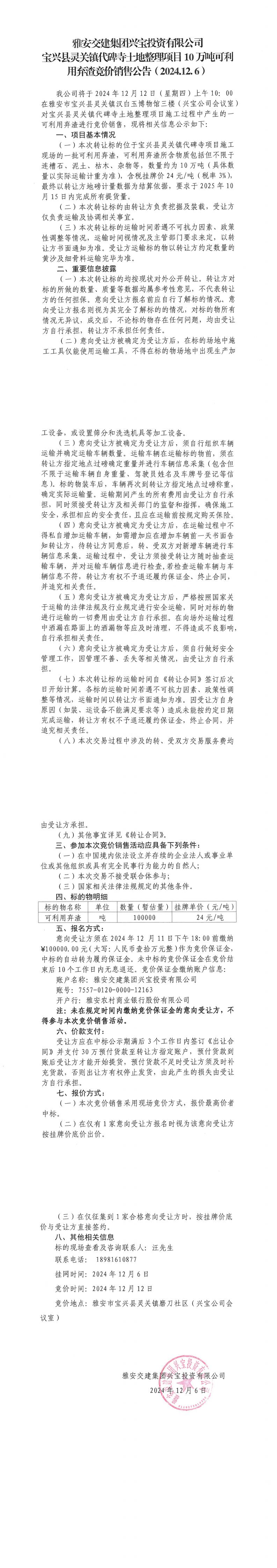 雅安交建集團(tuán)興寶投資有限公司靈關(guān)鎮(zhèn)代碑寺土地整理項目10萬噸可利用棄渣競價銷售公告(2024.12.06)